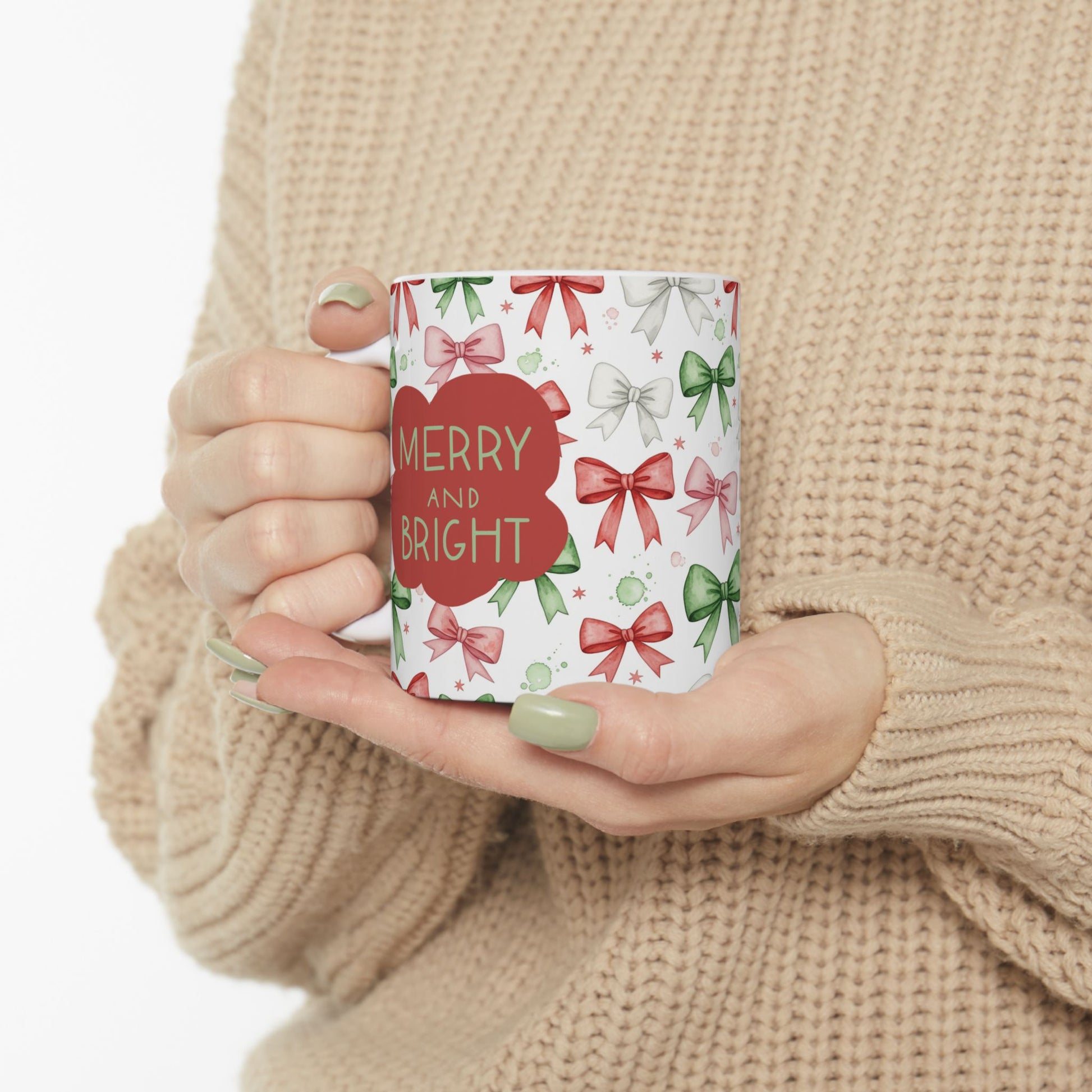 Christmas Bow Pattern Ceramic Mug — Holiday 'Merry & Bright' Gift Mug (11oz/15oz)