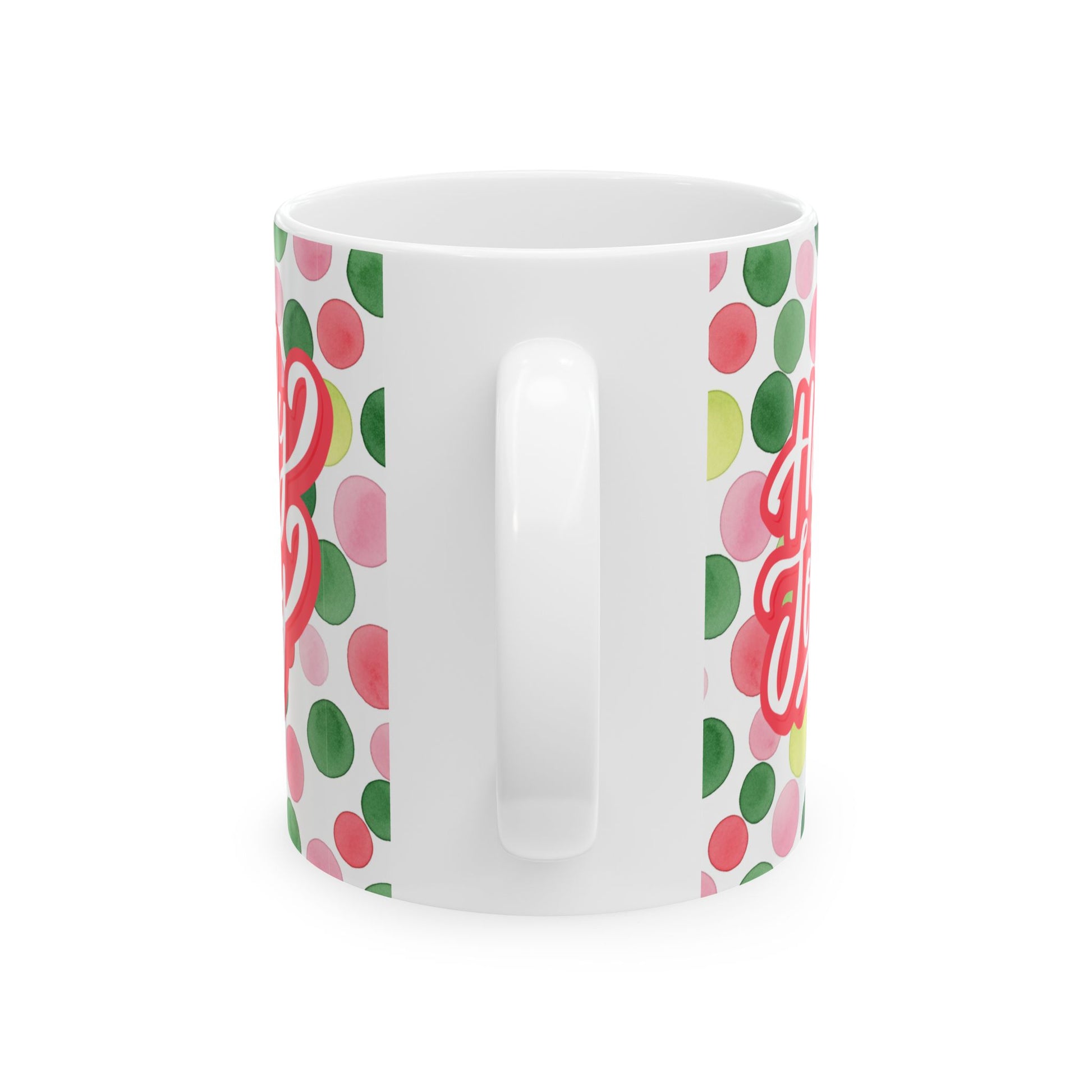 Bright, cheery, and made for everyday sipping — this glossy ceramic mug brings playful color to slow mornings and busy desks. Hand-lettered script peeks through a watercolor dot pattern in shades of pink and green, wrapping around the cup to create a lively, wraparound design that feels both handcrafted and modern. The comfortable C-handle and shiny finish make it easy to hold and pleasant to look at between sips. Durable white ceramic keeps the print vivid, and the mug is microwave- and dishwasher-safe so the design stays crisp through regular use. Lead- and BPA-free, it’s built to be used and enjoyed daily — whether for your first coffee, herbal tea at sunset, or a cozy mid-afternoon cocoa.